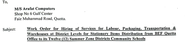 ARAFAT COMPUTERS WORK ORDER FOR DISTRIBUTION OF STATIONERIES TO OVERALL DISTRICTS OF SUMMER ZONE BEF CS