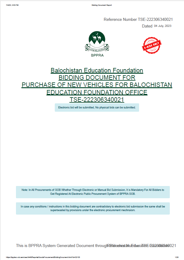 BIDDING DOCUMENT FOR PURCHASE OF NEW VEHICLES FOR BALOCHISTAN EDUCATION FOUNDATION OFFICE Letter of invitation for Bids: Sealed Tenders are invited under the Balochistan Public Procurement Rules (BPPR) – 2014 by the Balochistan EducationFoundation from “Eligible Bidders” dealing in Sales and after – sale services(as applicable) of Manufactured Vehicles &Accessories as per details contained here…