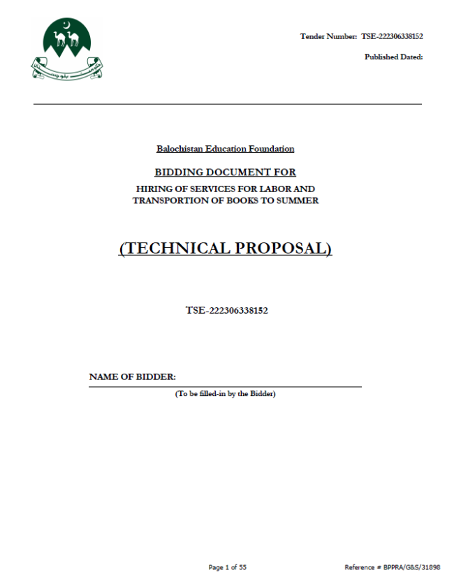 HIRING OF SERVICES FOR LABOR AND TRANSPORTION OF BOOKS TO SUMMER ZONE BEF SCHOOLS Letter of invitation for Bids: Sealed Tenders are invited under the Balochistan Public Procurement Rules (BPPR) – 2014 by the Balochistan Education Foundation from “Eligible Bidders” dealing in Sales and after – sale services(as applicable) of Transportation and Storage and Mail…