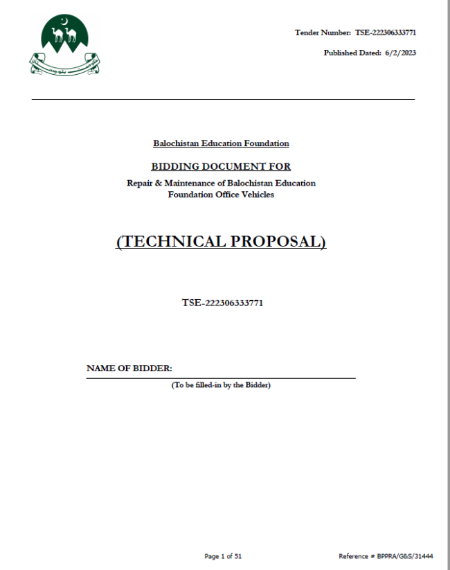 Repair & Maintenance of Balochistan Education Foundation Office Vehicles Letter of invitation for Bids: Sealed Tenders are invited under the Balochistan Public Procurement Rules (BPPR) – 2014 by the Balochistan Education Foundation from “Eligible Bidders” dealing in Sales and after – sale services (as applicable) of Repair & Maintenance of Vehicles as per details contained…