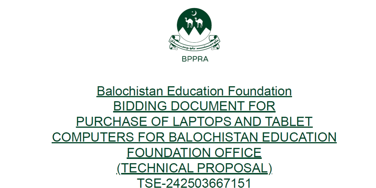 Sealed tenders are invited under the Balochistan Public Procurement Rules (BPPR) – 2014 by the Balochistan EducationFoundation from ‘Eligible Bidders’ engaged in the sale and after-sales services (as applicable) of ICT equipment (laptops andtablet computers), as per the details provided below:”